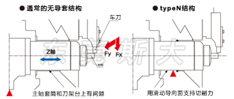 | 二、斯大走心機SR-32JMtypeN采用高剛性的“主軸筒滑動導向面構造”無導套結構,在滑動導向面上支持切削力,實現主軸臺的高剛性化. |