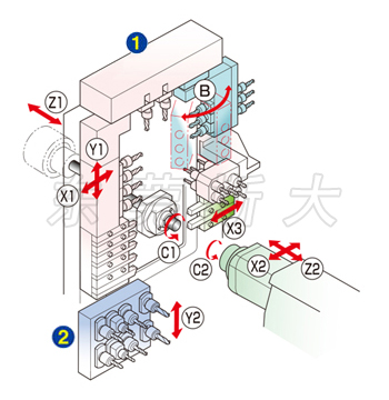 | 三、斯大走心機(jī)SR-38typeB采用門型刀架臺采用均等負(fù)荷橫向?qū)蚪Y(jié)構(gòu),抑制直動導(dǎo)軌軸承所受的力矩負(fù)重至最小限度,確保刀架臺剛性,并在門型刀架臺的后面排刀座附加X3控制軸,通過X1、X3軸同步控制實(shí)現(xiàn)對工件進(jìn)行均衡切削,抑制工件偏轉(zhuǎn)實(shí)現(xiàn)高精度加工,縮短切削時間。 |