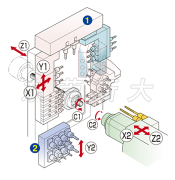 | 四、斯大走心機SR-20RIVtypeA了進一步實現多樣化復合加工,充實了背面側的功能,從而在背面刀架臺配備8軸鉆孔單元,并搭載Y2軸控制作為標配,在刀架臺上備有可通過手動調節控制的角度型回轉動力單元,可使得刀具可在工件外圓和端面上加工帶角度的傾斜表面。 | |||
